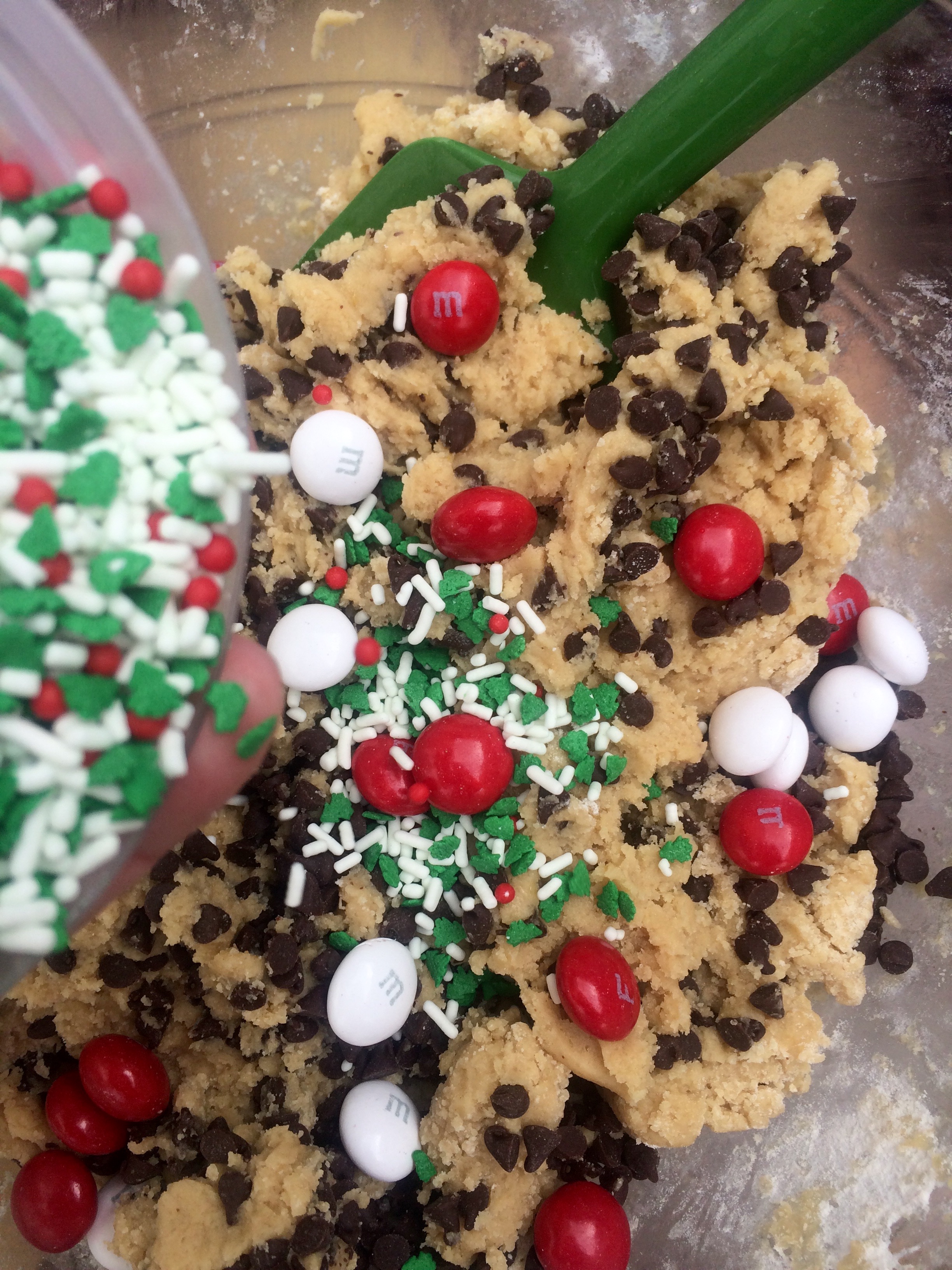 - Mix in the chocolate chips and M&M’s® White Peppermint with a spoon.